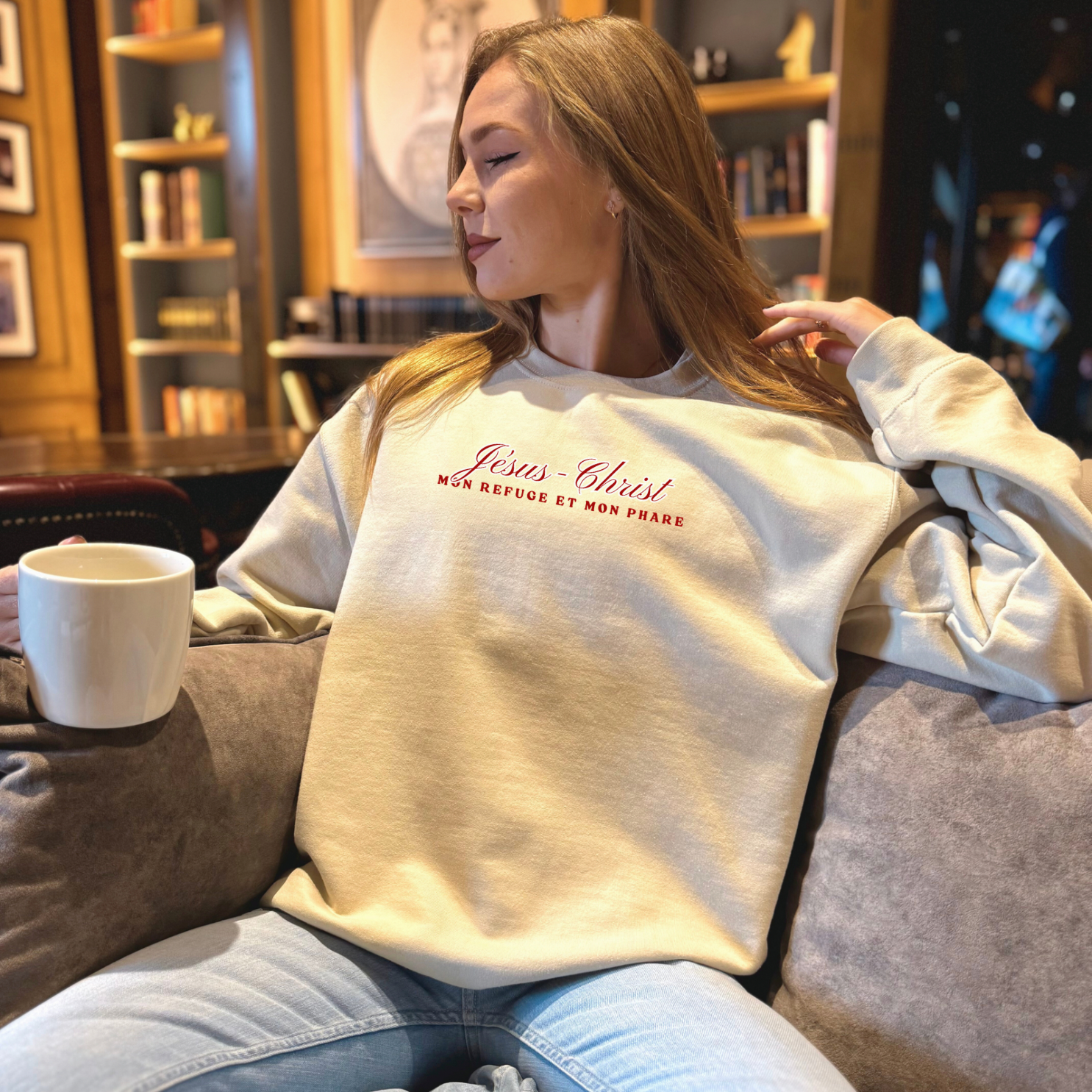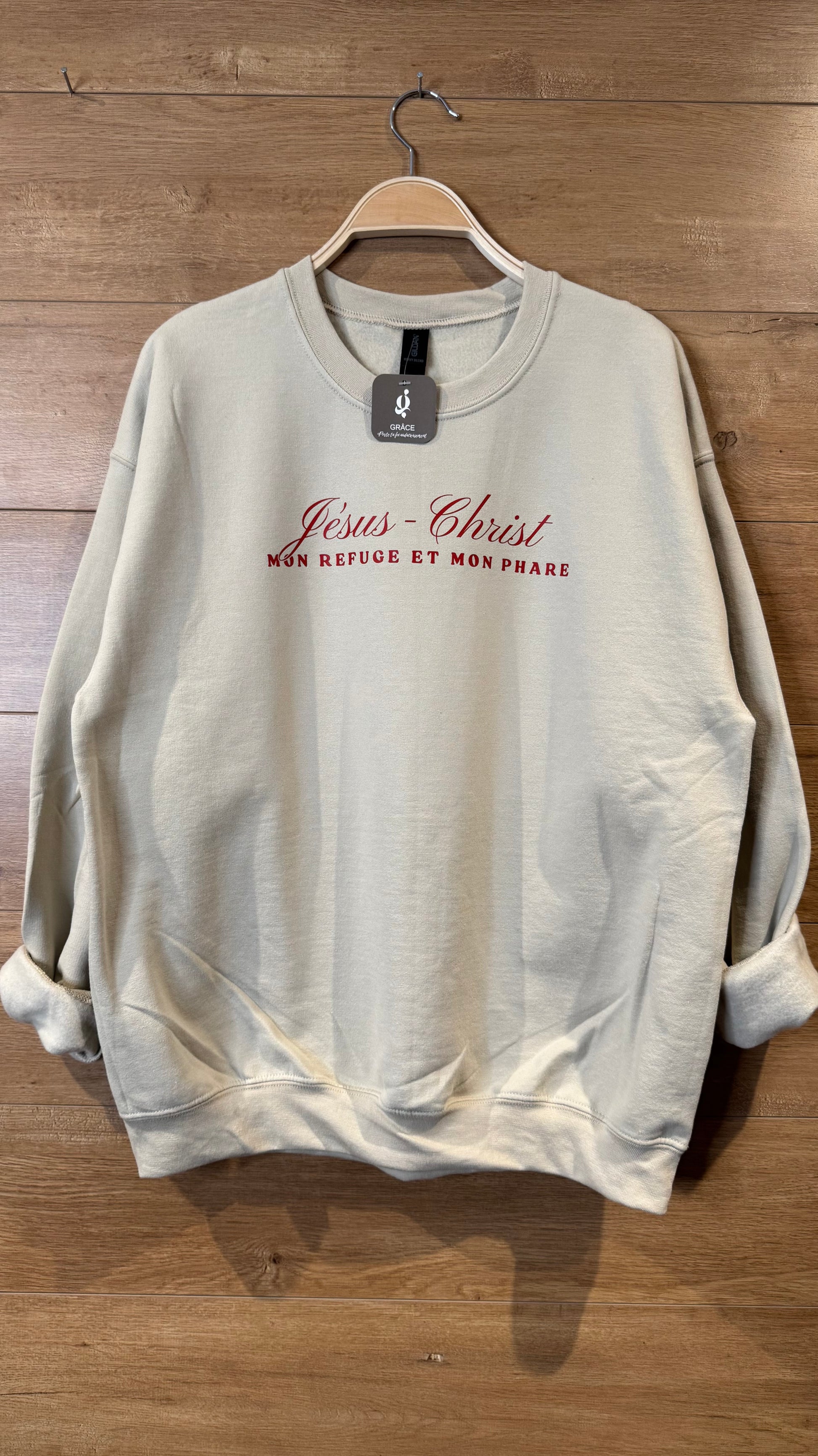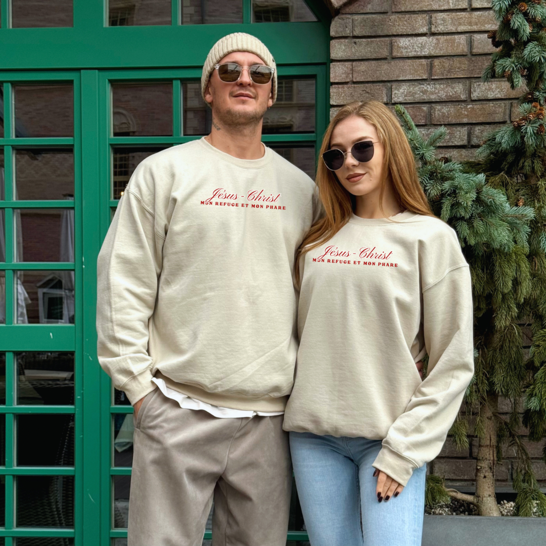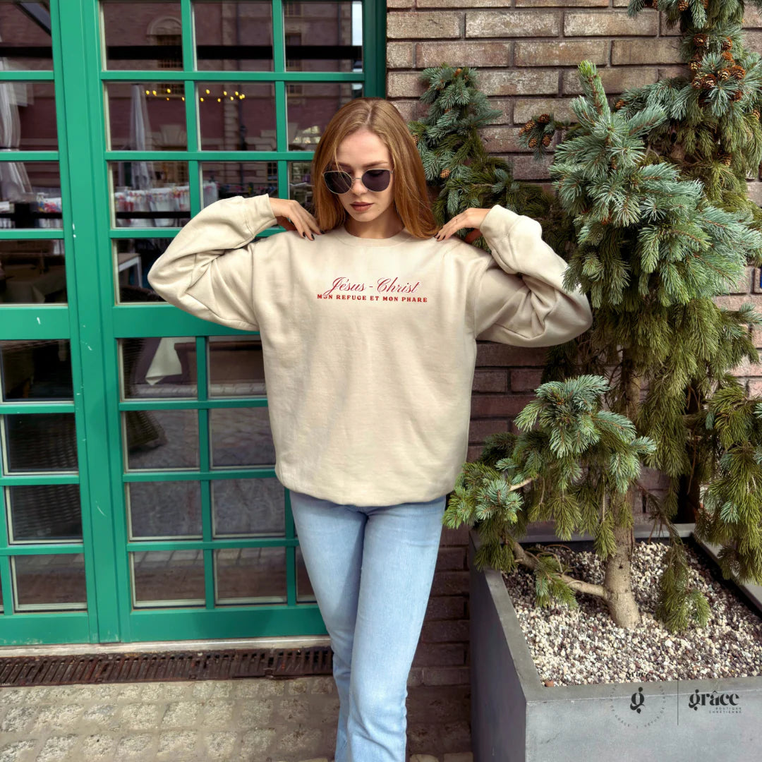 Chandail LE CALME DANS LA TEMPÊTE: Jésus-Christ, mon refuge et mon phare est un modèle unisexe taille régulière, couleur sable.